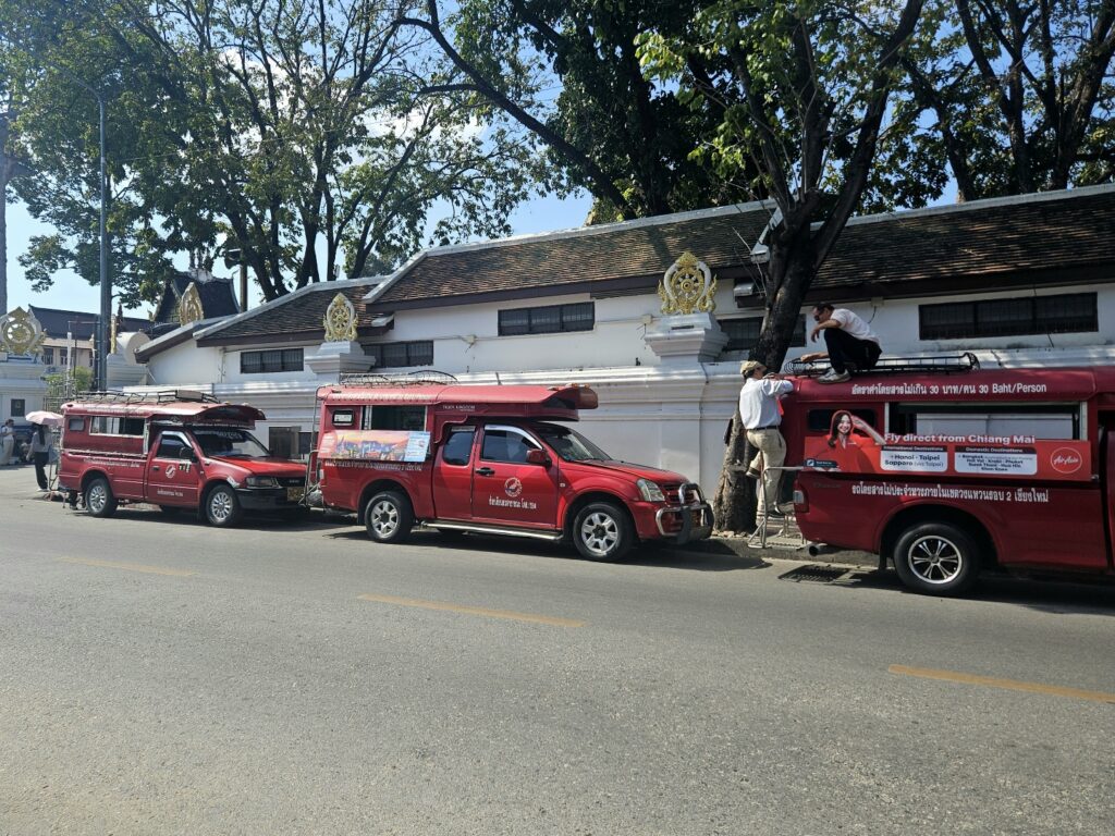 Scooter rental is slightly more expensive in Chiang Mai at 200–350 baht/day. Ride sharing or Grab are inexpensive at 100 baht for the average journey, though the price jumps massiveky the further you go from the city. Red trucks (songthaews) cost 30–60 baht around old town. Walking is also a good option to burn off khao soi.